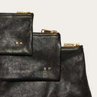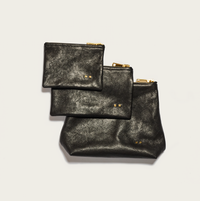 Our zero-waste philosophy leads us to seek beautiful ways to use every inch of our leathers. Each pouch is unique in material, and all feature Savas’ Two Dots. A limited number is be available in each colorway.