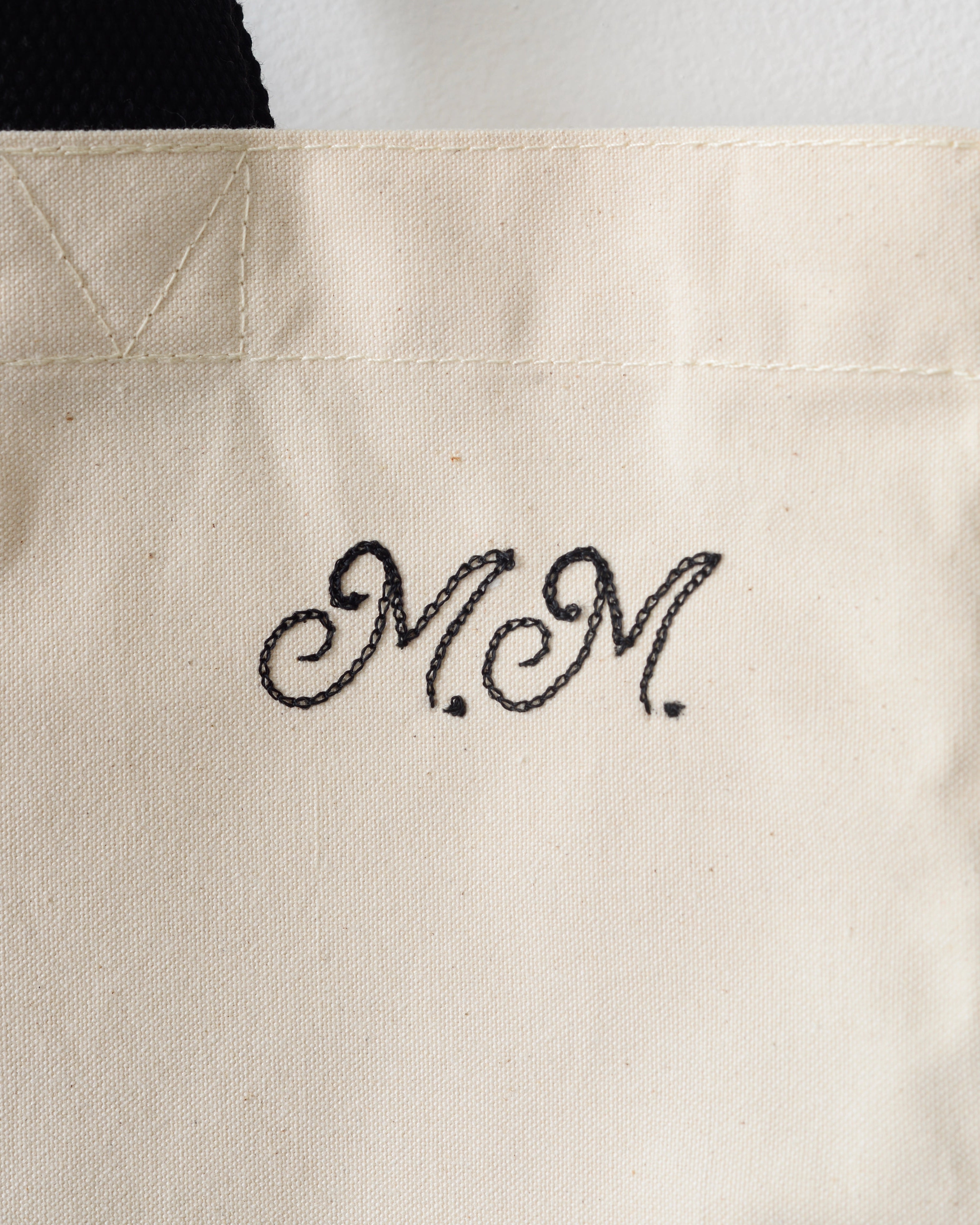 The Great Tote is available to be customized with either your name, initials or your personal slogan embroidered with our hand-cranked chainstitch machine.