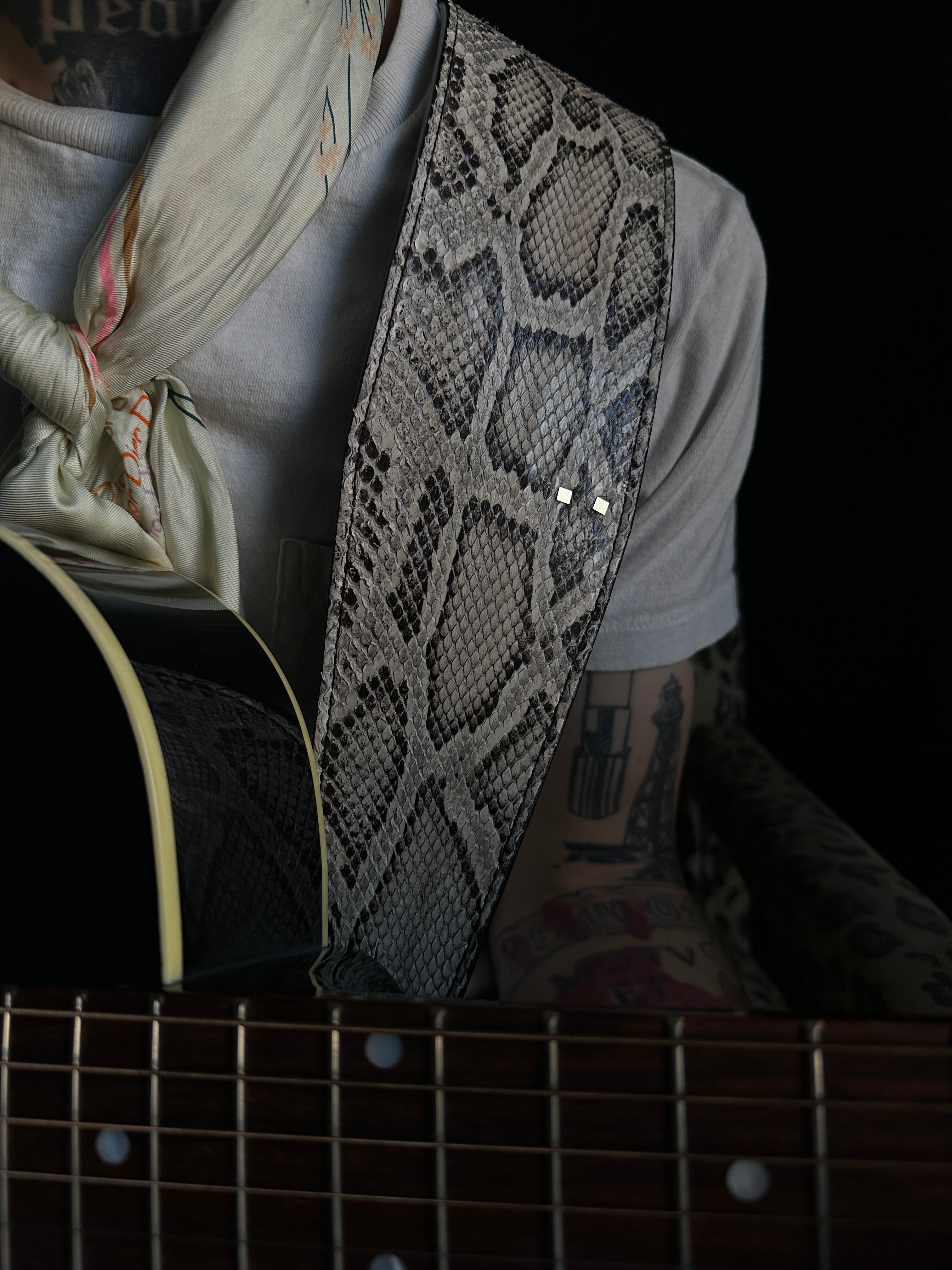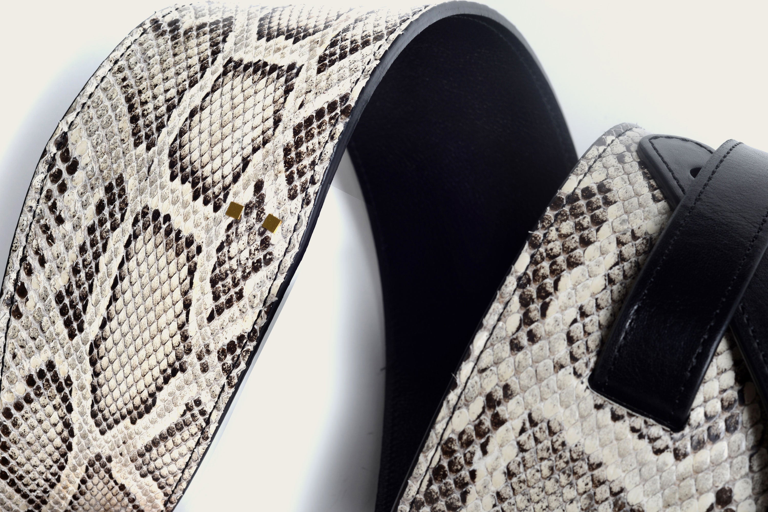 Whether on arena stages or in home studios, The Savas Guitar Strap compliments your favorite guitar. Made of wild Python leather, each of these straps has a unique pattern. Featuring our Two Dots brass rivets, these comfortable straps are made to mold to your shoulder yet are thoughtfully constructed to retain stability and shape without stretching so your axe is safe and sound.