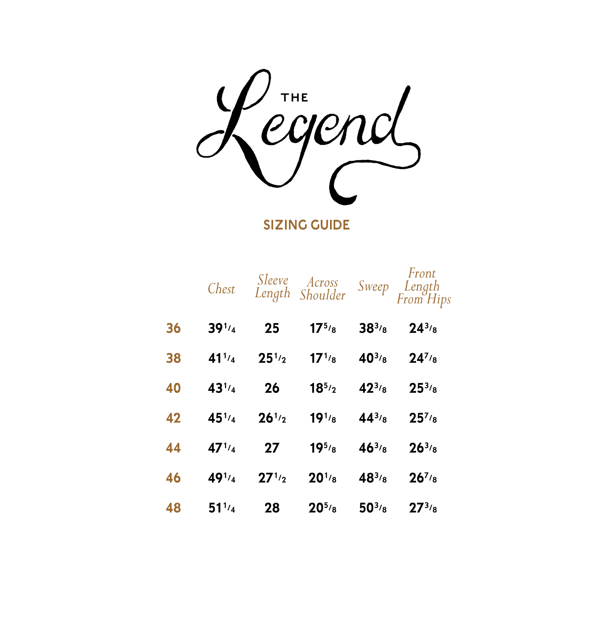 | Chest | 40 3/4 | 42 3/4 | 44 3/4 | 46 3/4 | 48 3/4 | 50 3/4 | 52 3/4 | 54 3/4 | 56 3/4 |