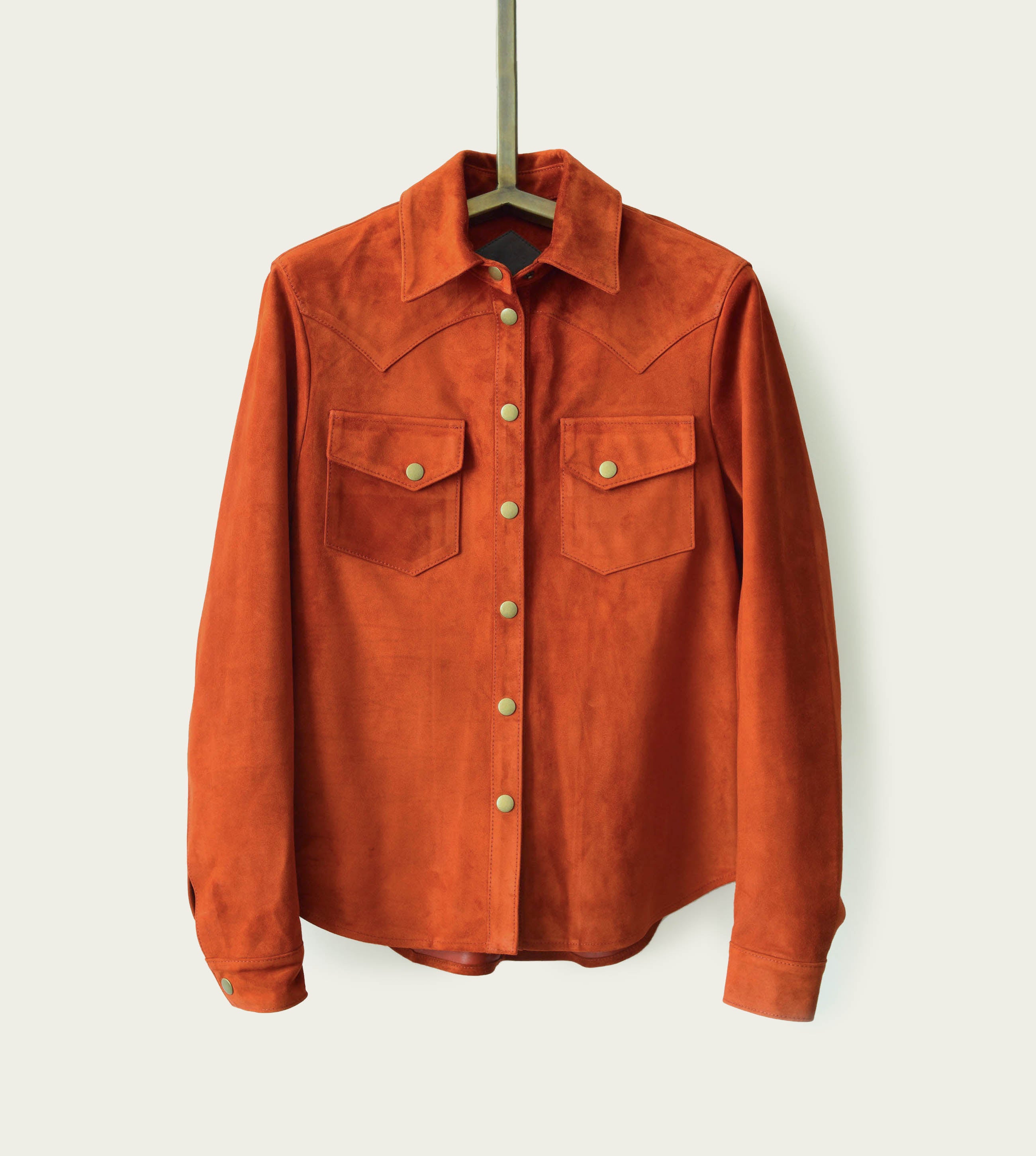 Saffron threads have been used since ancient times as dyes, medicines and perfumes. When scattered over a bed, or mixed into a tea it was understood to cure bouts of melancholy. The Saffron Suede Lowry shirt jacket is sure to do that for you.