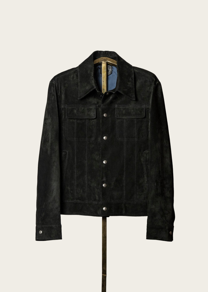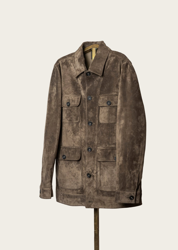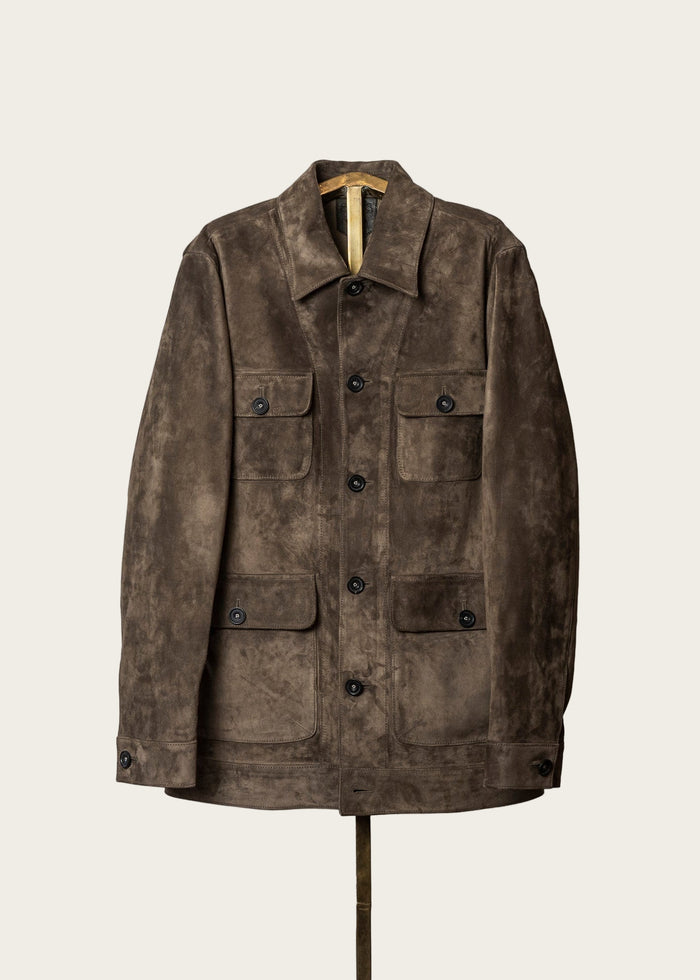The Legend suede jacket in a rich, neutral tone, featuring a slim tailored fit, subtle western shoulder yoke, three exterior zippered pockets, and adjustable sleeve gussets. Made from lightweight, malleable calf suede designed for timeless style and durability.