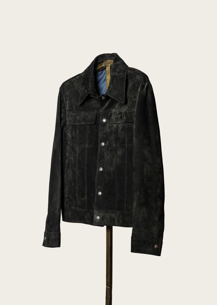 Savas Roving overshirt in Aster Blue — artisan-made Italian suede shirt jacket for men, crafted from premium full-grain calf suede.