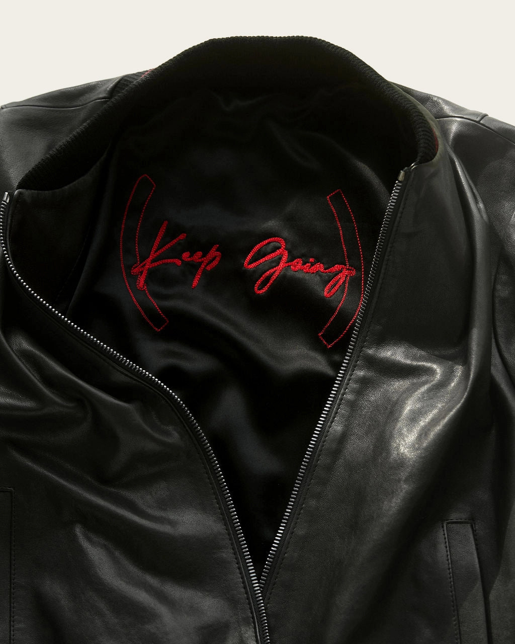 The (RED) Bomber is a vintage inspired silhouette with hand knitted details, our iconic “two dots” in red, and our internal motto “(Keep Going)” embroidered on the interior. Limited edition and Made to order in 6-8 weeks.