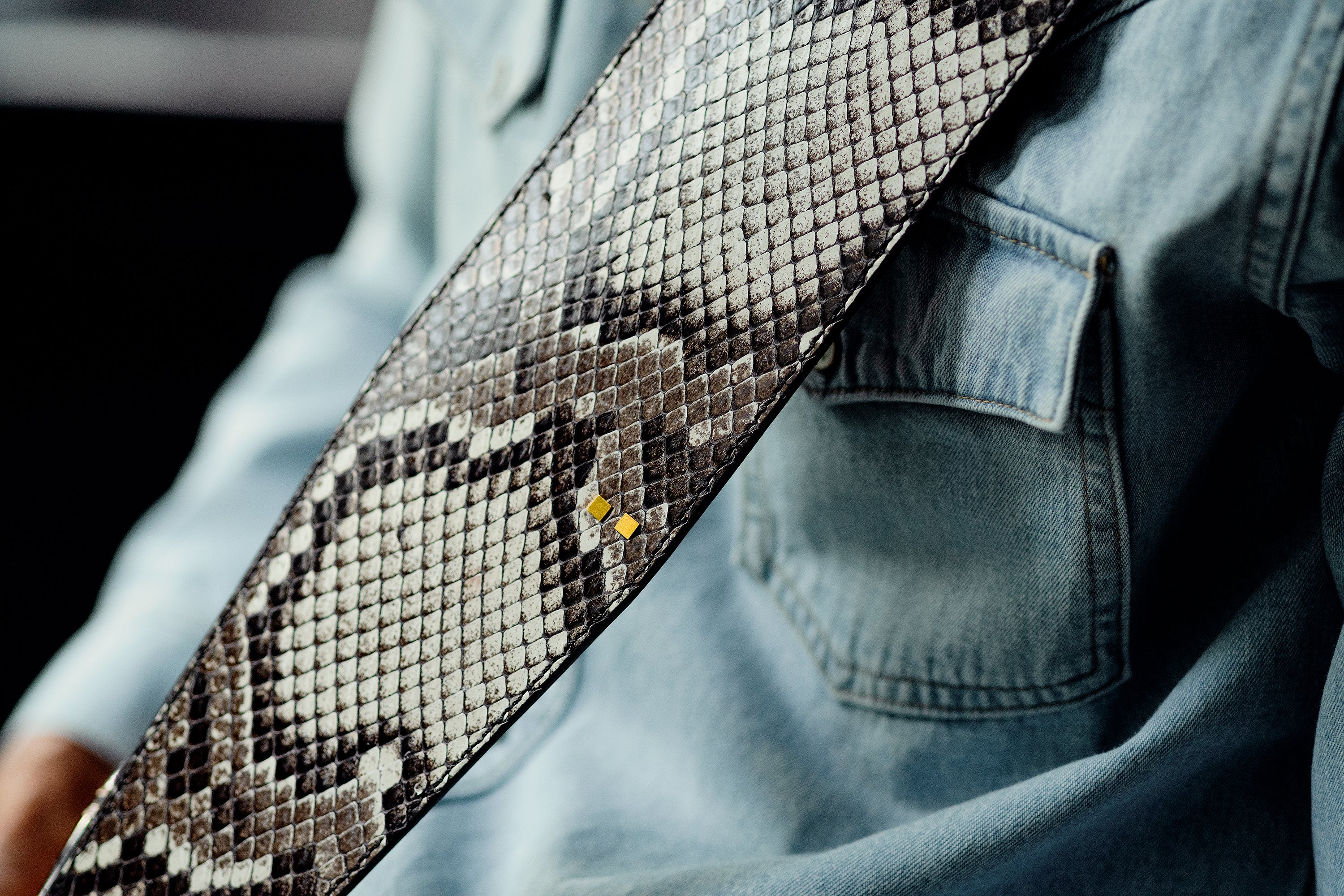Whether on arena stages or in home studios, The Savas Guitar Strap compliments your favorite guitar. Made of wild Python leather, each of these straps has a unique pattern. Featuring our Two Dots brass rivets, these comfortable straps are made to mold to your shoulder yet are thoughtfully constructed to retain stability and shape without stretching so your axe is safe and sound.