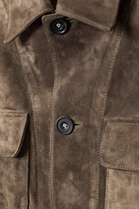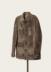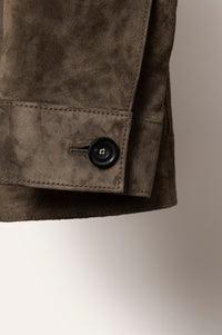 The Irving has single needle 1/8” stitching on the top collar, collar stand, patch pockets, pocket flaps, cuffs, waistband, and back yoke, as well as from shoulder to hem band to secure the internal facing. Signature Box Stitch detail on each keyhole-shaped buttonhole. Anchored with genuine buffalo horn buttons, each unique in color and configuration. There are six at center front and one on each pocket flap. In lightweight, Mondrian Grey Calf suede.