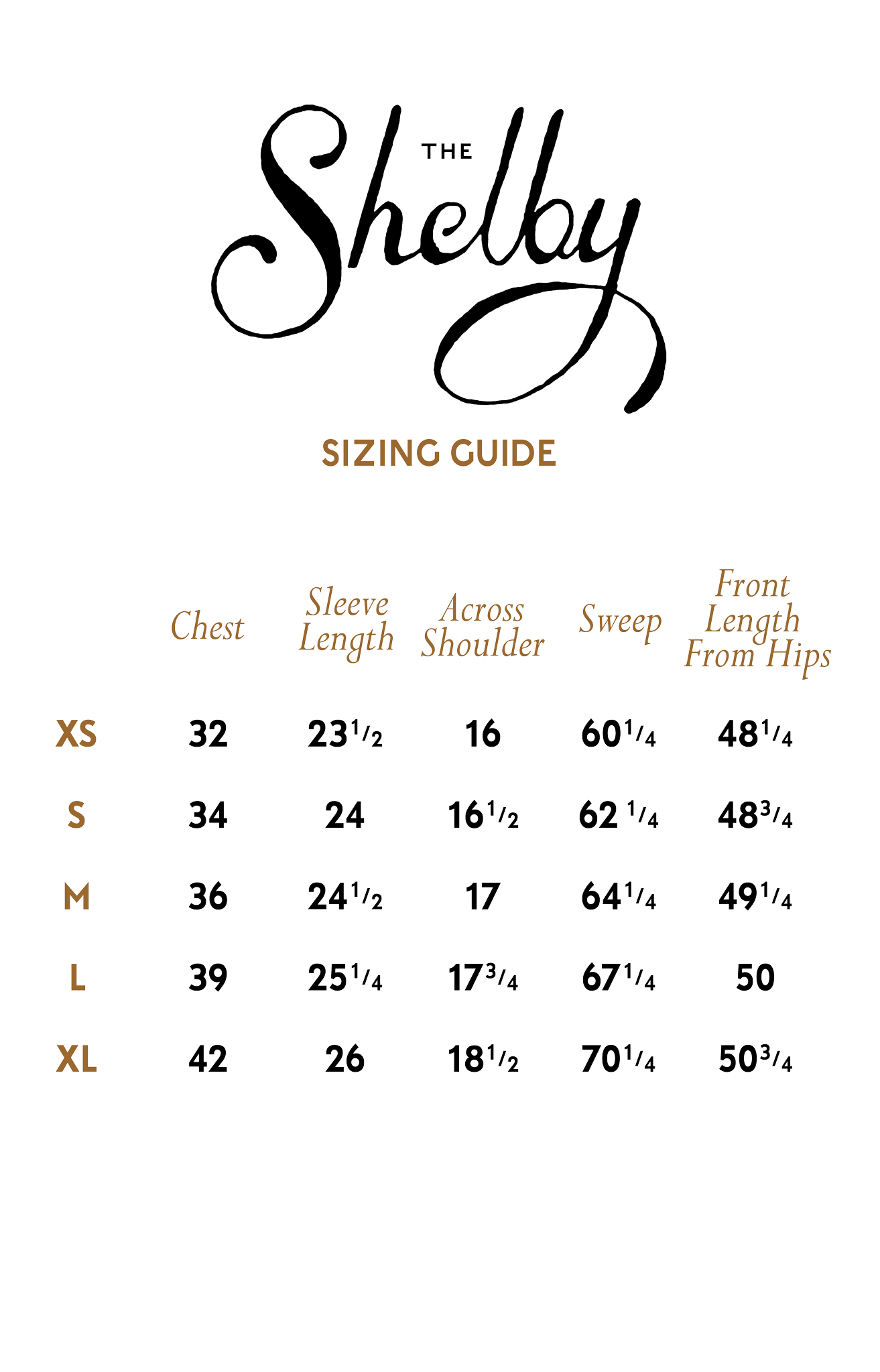 | Sleeve length | 24 1/2 | 25 | 25 1/2 | 26 | 26 1/2 | 27 | 27 1/2 | 28 | 28 1/2 |